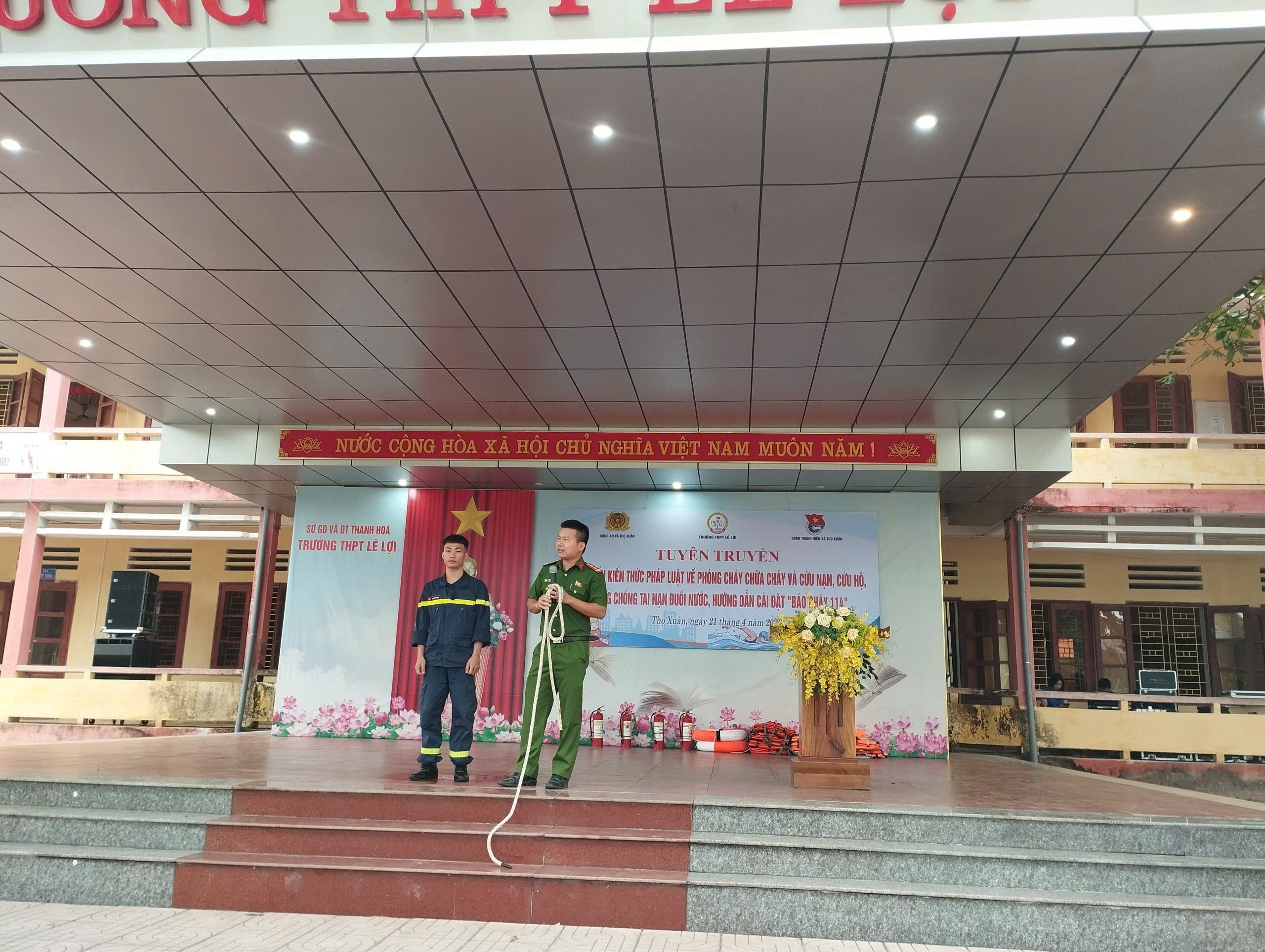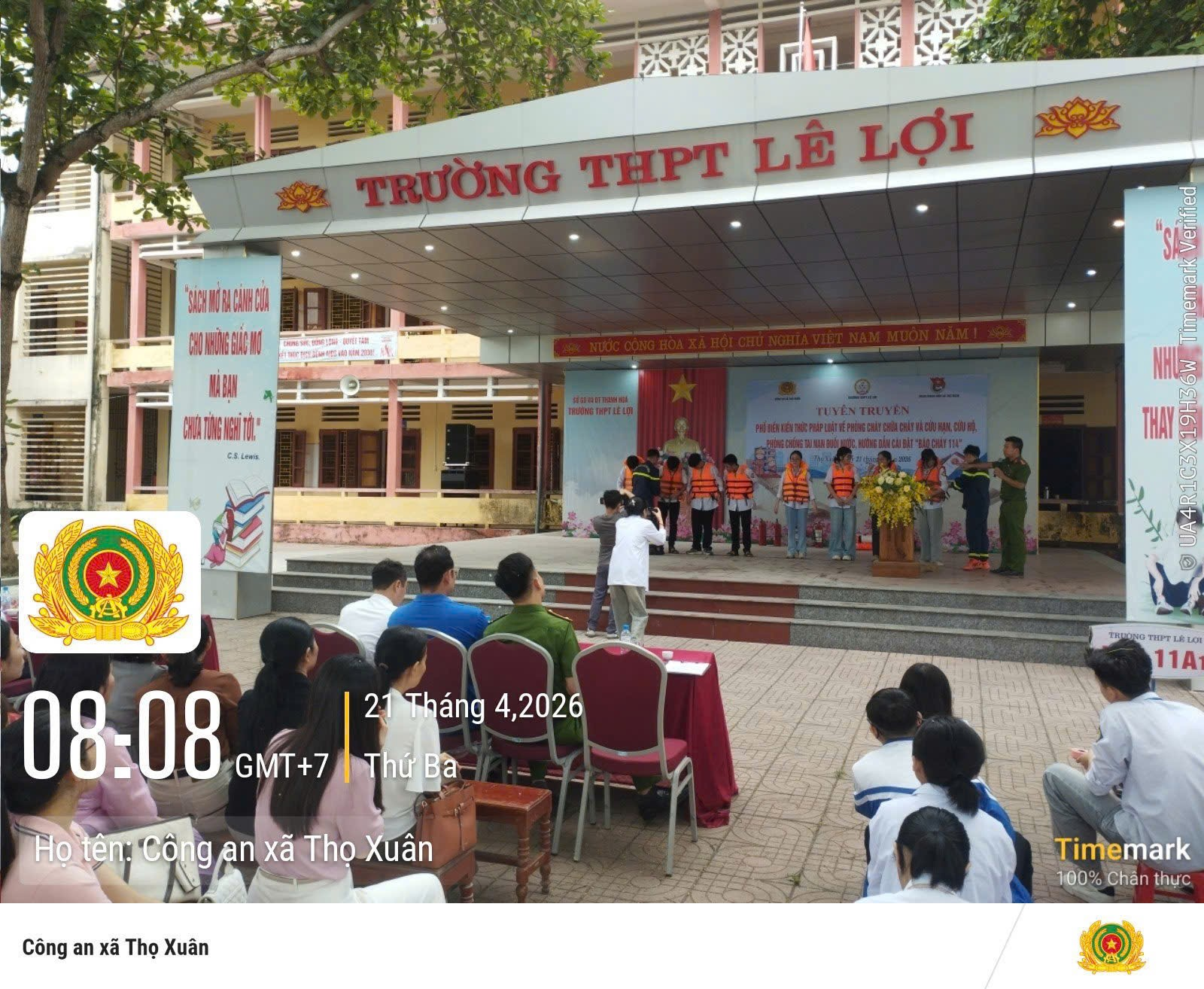 Nhằm nâng cao nhận thức, trang bị kiến thức pháp luật và kỹ năng xử lý tình huống cho học sinh, ngày 21/4/2026, Đoàn xã Thọ Xuân phối hợp với Công an xã, Trường THPT Lê Lợi và Đội Chữa cháy và Cứu nạn cứu hộ khu vực 5 – Phòng PC07, Công an tỉnh Thanh Hóa tổ chức chương trình tuyên truyền, cập nhật kiến thức pháp luật về phòng cháy chữa cháy, cứu nạn cứu hộ, phòng chống tai nạn đuối nước và hướng dẫn cài đặt ứng dụng báo cháy 114.