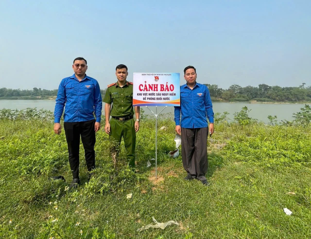 Công an xã Thọ Xuân phối hợp cùng Đoàn thanh niên xã cắm biển cảnh báo nơi khu vực nước sâu nguy hiểm phòng chống đuối nước